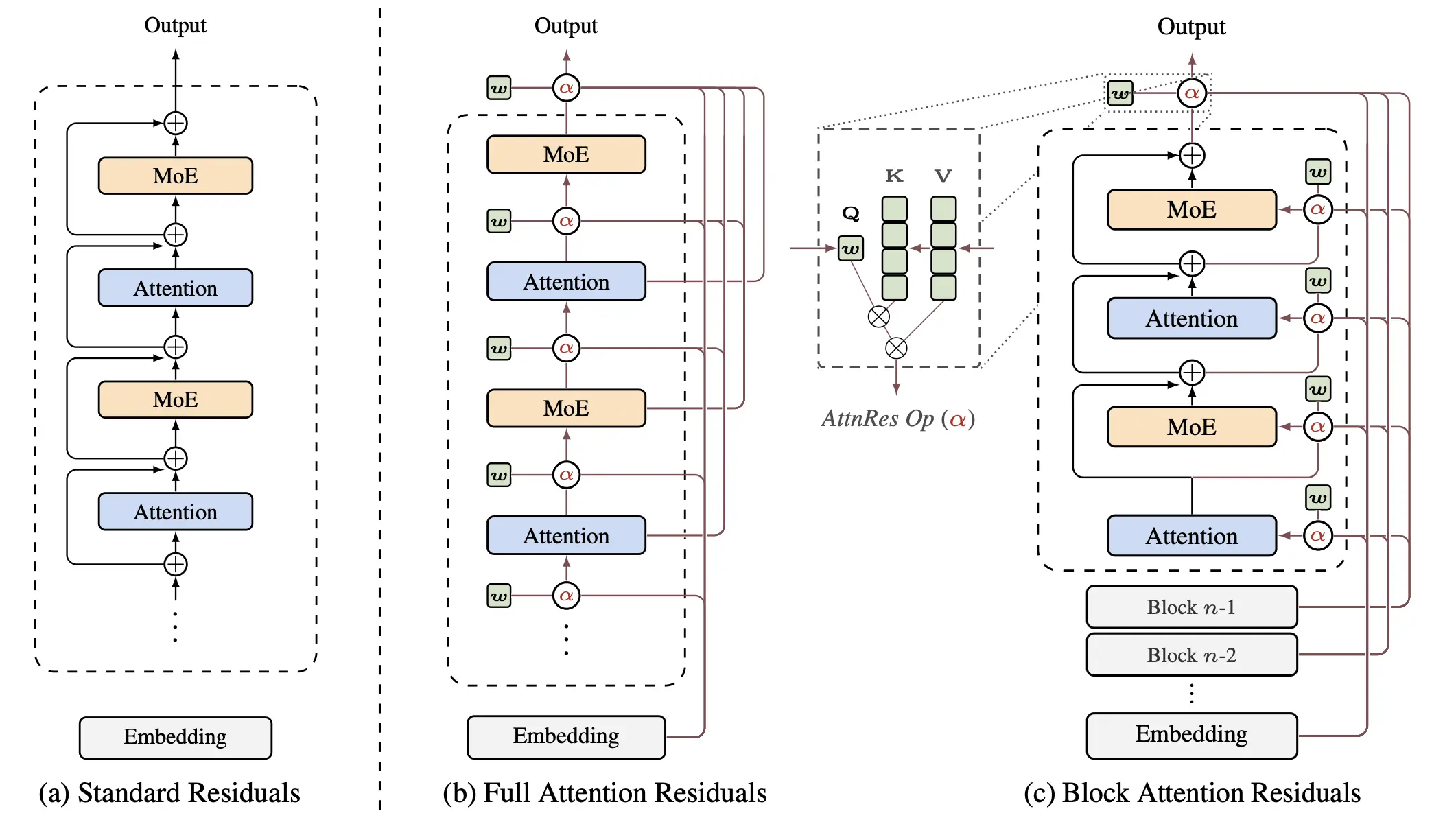 (a) Standard residuals with uniform additive accumulation. (b) Full AttnRes: each layer attends over all previous outputs. (c) Block AttnRes: layers are grouped into blocks, reducing memory from O(Ld) to O(Nd).