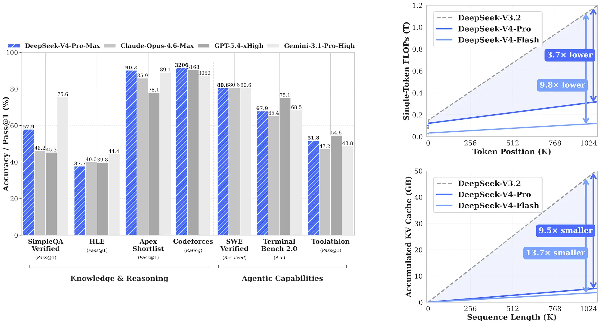 - Hybrid Attention Architecture: We design a hybrid attention mechanism combining Compressed Sparse Attention (CSA) and Heavily Compressed Attention (HCA) to dramatically improve long-context efficiency. In the 1M-token context setting, DeepSeek-V4-Pro requires only 27% of single-token inference FLOPs and 10% of KV cache compared with DeepSeek-V3.2.